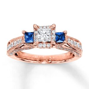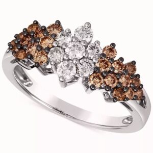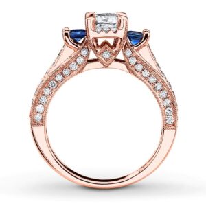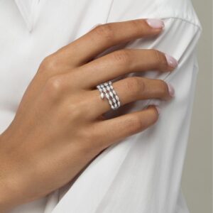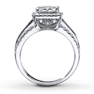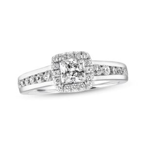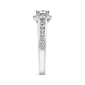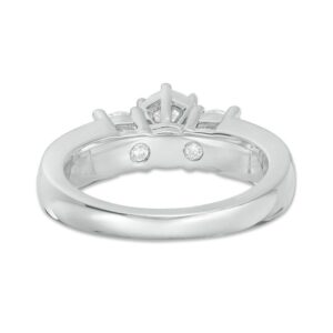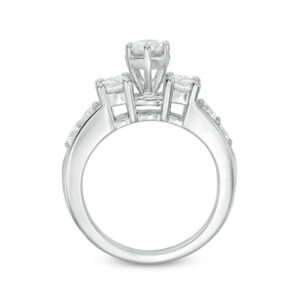 On the day you ask for her hand in marriage, honor her with a three stone diamond bridal set that honours love. Exquisite in 14K white gold, the engagement ring dazzles with three round diamonds as its focus.And two small round diamonds complete the look. On your wedding day, complete the ensemble with the coordinating wedding band, which also features three round diamonds flanked by round stones set into the shank.t.w. of diamonds and a polished shine.