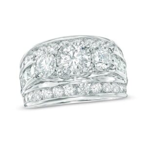 Woo her, wow her and win her with this exceptional three stone diamond ring. Fashioned in 14K white gold, the eye is drawn to the three shimmering round diamonds – the largest an impressive 1/2 ct. – set in perfect alignment across the diamond-lined . Borders of smaller round accent diamonds at the top and bottom of the style add even more radiant sparkle. Punctuated with two small round diamonds is engraved on the inside of the ring shank, a promise to always be by her side. A look she,ll treasure forever, this ring captivates with 4 cts. t.w.