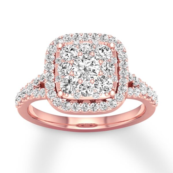 For an everlasting love, never-ending sparkle. Awash in round diamonds, this extraordinary engagement ring is crafted of 14K rose gold. The ring has a total diamond weight of 3/4 carat.