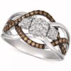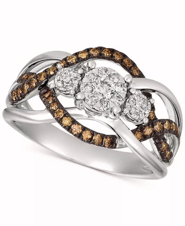 A trinity of round-shape white diamond clusters sits atop an openwork round-shape chocolate diamond accented shank to create this stunning ring (3/8 ct. t.w.)