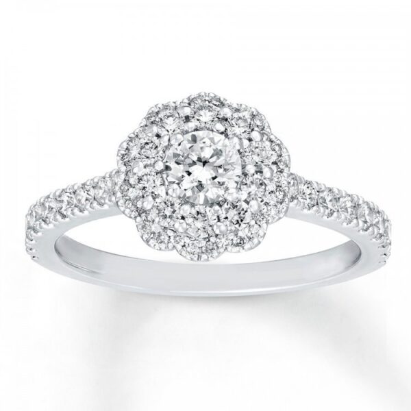 This breathtaking engagement ring? features a shimmering round diamond haloed by smaller round diamonds as the floral-inspired focal point. Additional diamonds grace the 14K white gold band, bringing the total diamond weight to 1 carat.