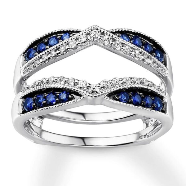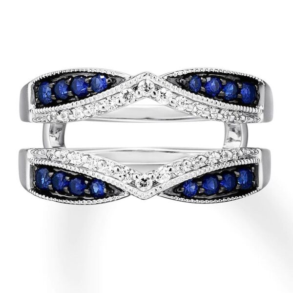 Designed to add brilliance and color to your diamond solitaire ring (sold separately), this enhancer ring features sparkling round diamonds lining chevrons above and below the center. Natural sapphires outlined in milgrain detailing define the edges to complete the look. Crafted of 14K white gold, the ring has a total diamond weight of 1/5 carat.