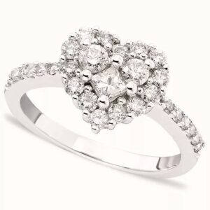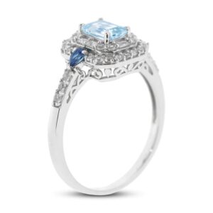 Brilliant round diamonds sweep across the band and halo the dazzling 1/2-carat oval diamond center of this thrilling engagement ring. Princess-cut sapphires, the signature of the collection and a symbol of faithfulness and everlasting love, are set into the ring bezel. With a total diamond weight of 1 3/8 carats, the 14K white gold ring is a brilliant beginning to your romantic love story.