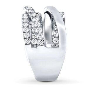 Three rows of fiery round diamonds weave over and under near the top edge while two sweeps of 14K white gold flow over an additional row of diamonds near the lower edge in this stylish ring for her The ring has a total diamond weight of 1 1/2 carats the Galleria of Jewelry Previously Owned Treasures are not eligible for in-store pick-up Previously Owned Treasures may only be shipped either to your home address or to an alternate address.