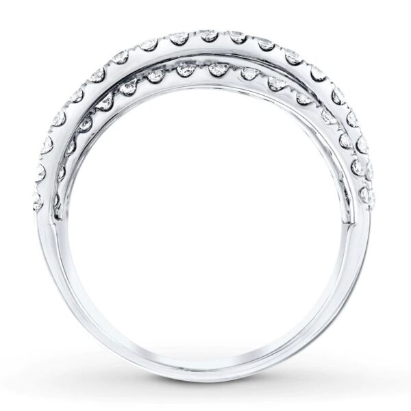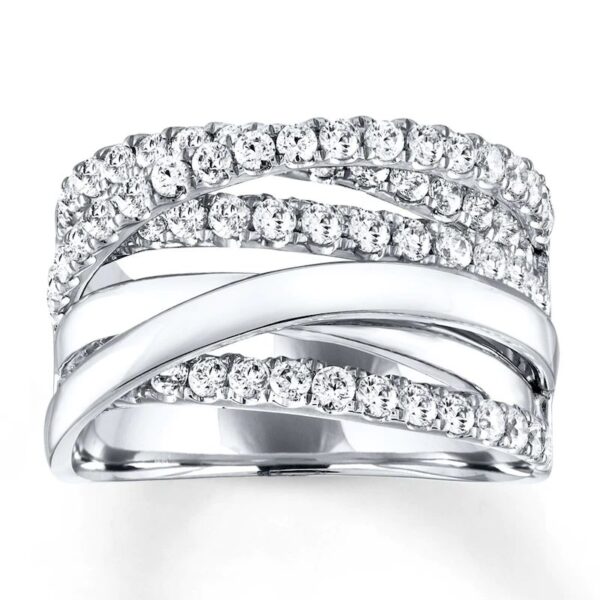 Three rows of fiery round diamonds weave over and under near the top edge while two sweeps of 14K white gold flow over an additional row of diamonds near the lower edge in this stylish ring for her The ring has a total diamond weight of 1 1/2 carats the Galleria of Jewelry Previously Owned Treasures are not eligible for in-store pick-up Previously Owned Treasures may only be shipped either to your home address or to an alternate address.